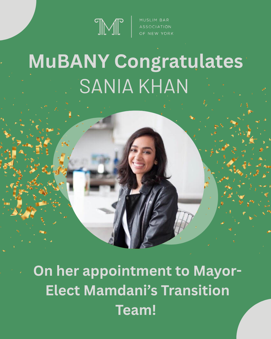 Huge congratulations to former MuBANY President Sania Khan on being named to Mayor Zohran Mamdani’s Transition Team!